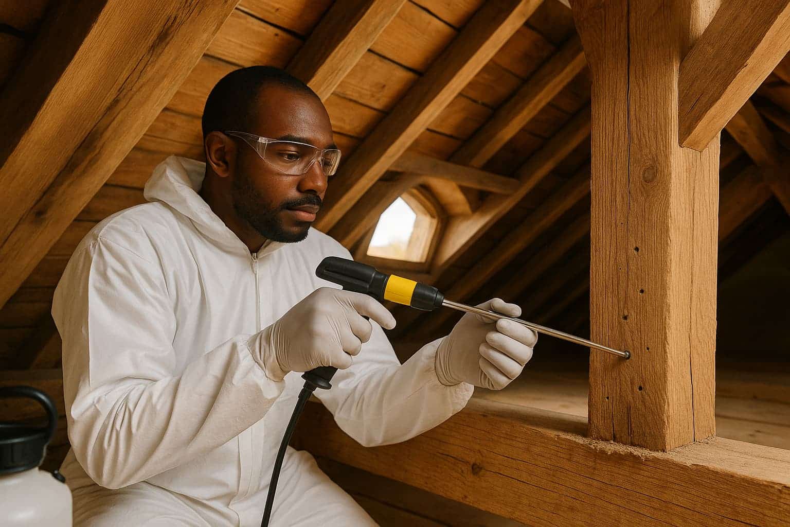 - Utilisation de biocides homologués : produits conformes à la réglementation en vigueur, manipulés par des opérateurs formés et certifiés au traitement des insectes xylophages.